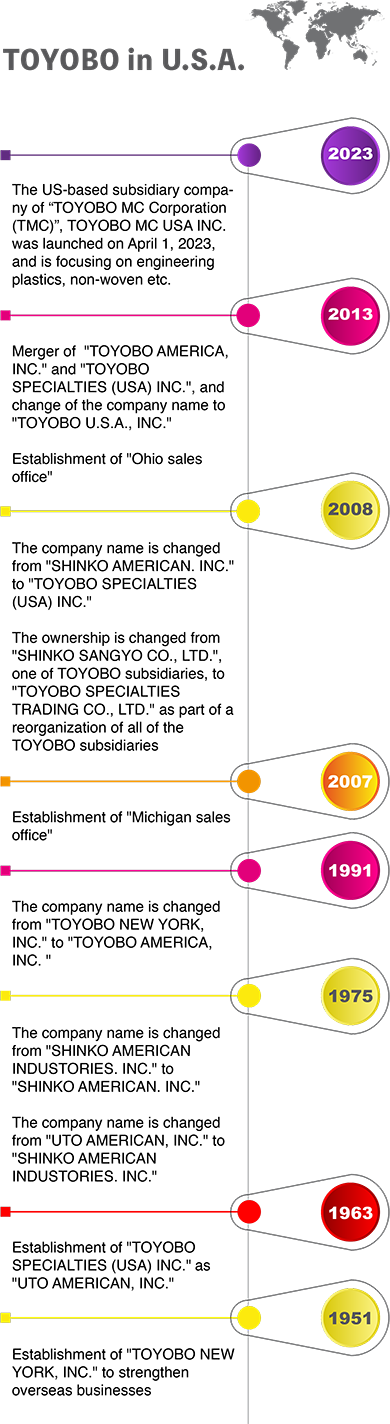 Our original entity TOYOBO NEW YORK was founded in 1951. Since then, we have provided high-quality products across the U.S. Currently, TOYOBO U.S.A., INC. is primarily responsible for our Healthcare line, Films, and similar products, while TOYOBO MC U.S.A., INC. mostly supplies our Functional Polymers and Industrial Materials in North America.