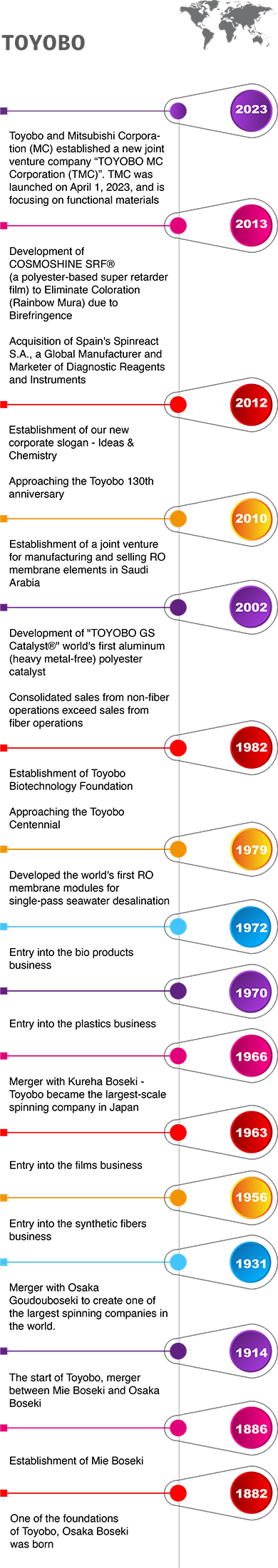 Toyobo was founded in 1882 as a textile company, when it began its spinning business. We continued to adapt to the changing needs of the times, drawing on our core technologies in polymerization, modification, processing, and biotechnology to expand our business fields and develop high-performance products. These product lines have been organized into three specialty business segments — Films & Functional Polymers, Industrial Materials, and Healthcare — in which we are prioritizing growth and expansion. We have further identified "priority businesses" within these specialty businesses in which Toyobo has a particular strength, and which we hope to nurture and develop into a core business. To accomplish this, we are concentrating business resources in order to accelerate growth. We also actively pursue business alliances and/or technology innovation to further enhance already.